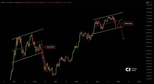 Sindsdien keerde het tij, en naderde BTC de onderkant van het kanaal – steun gevonden net boven $80k. Dat gebied tussen $80.000 en $100.000 markeert Rover als de relief rally, net als de midline bounce in 2021.