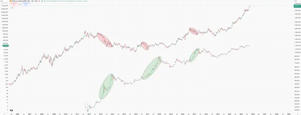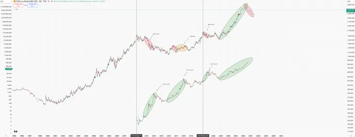 cycli eindigde de bullmarkt van Bitcoin pas toen goud al in een bearmarkt zat.
