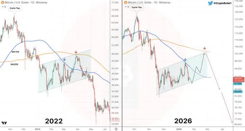 Naast on-chain data en ETF-stromen circuleert er ook een technische vergelijking met 2022. Analist Crypto Bullet