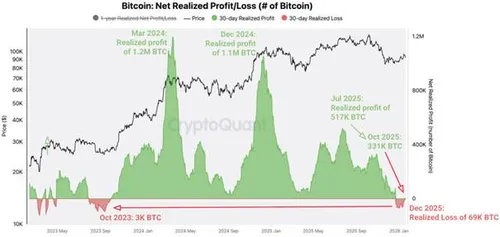 De analisten noemen dit een mogelijke “regime shift”: sinds 23 december stapelen de gerealiseerde verliezen zich op (CryptoQuant spreekt over een cumulatief verlies ter grootte van ongeveer 69.000