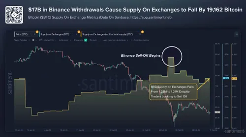 Binance alleen al verwerkte bijna $17 miljard aan uitstroom, waardoor het aanbod op de exchange daalde van ongeveer 1,23 miljoen BTC naar 1,21 miljoen BTC – een netto-uitstroom van 19.162 BTC. Dat was geen winstneming, maar pure risicoaversie.