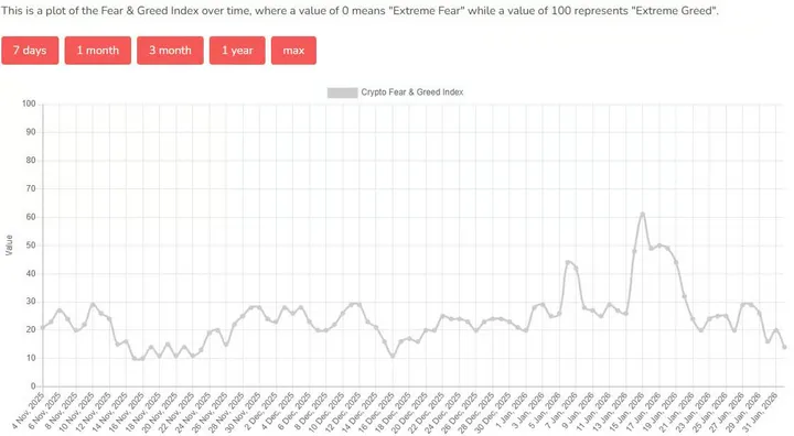 Dat is een verlies van ruim $17.000 sinds de piek van $95.500 op 18 januari – en het laagste niveau sinds april 2025.De markt is overspoeld door extreme angst. De Bitcoin Fear & Greed Index staat op 14 – het laagste niveau sinds half december.