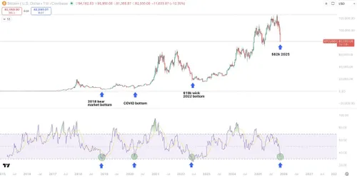 Opvallend is de RSI op weekbasis: die bereikte een van de laagste niveaus in jaren, vergelijkbaar met eerdere diepe bodems in 2018, de COVID-crash en de bearmarkt van 2022. Historisch gezien volgden zulke oversold RSI-waarden vaak sterke rebounds, al hangt de timing af van bredere marktkrachten.