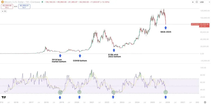 gedeeld door analist Nexus op TradingView, toont een forse correctie: de candle opende rond $94.000, dook naar een low van circa $81.000 en sloot rond $82.550 – een daling van meer dan 12% in één week.