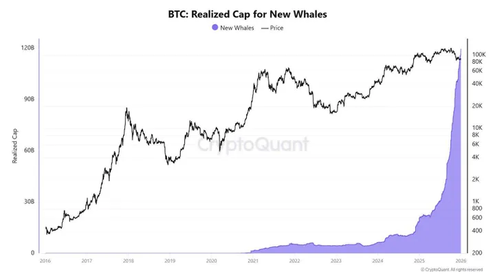 Tegelijkertijd groeit de invloed van 'new whales'. De gerealiseerde limiet (realized cap) van nieuwe grote holders schiet omhoog en nadert de $120 miljard, volgens CryptoQuant-charts.