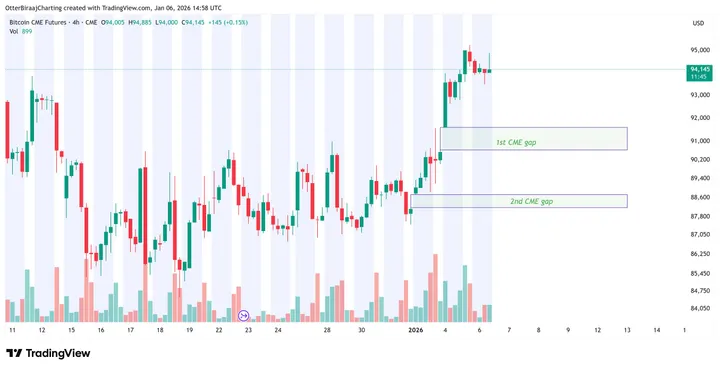open CME gaps uit het weekend en jaarwisseling: rond $90.600-$91.600 en lager bij $88.170-$88.700. Historisch vullen gaps zich vaak, dus bij een reject rond $96.000 kunnen die lager een rol spelen als magneten voor een correctie.