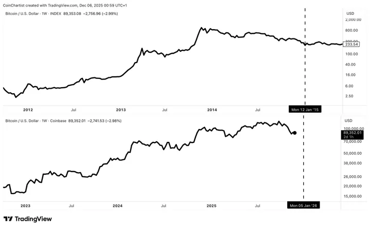 Hij plakte er zelfs twee grafieken bij: eentje voor de prijsontwikkeling naast de RSI in beide periodes. In 2012-2015 hing Bitcoin rond de 233 dollar toen de bodem zich vormde, nu zitten we op die 89K.