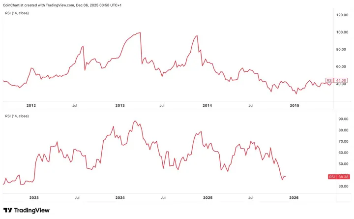 Severino zoomt in op de timing van die sleutelmomenten. In de oude cyclus klom de RSI gestaag, met een paar snelle opflakkeringen van extra power. Uiteindelijk ebde het momentum weg, zakte de lijn en nestelde zich rond de 44 – een middenweg die niet te heet of te koud was.