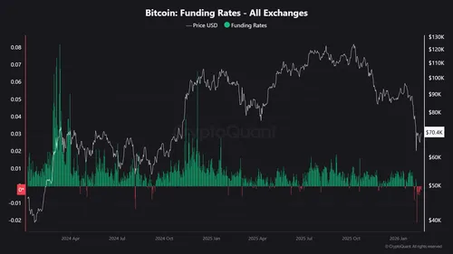 Begin 2026: funding werd negatief rond de dip naar $60k – shorts betaalden premies om vast te houden. Open interest piekte op ~$45 miljard, daalde scherp naar $22 miljard: massale deleveraging.