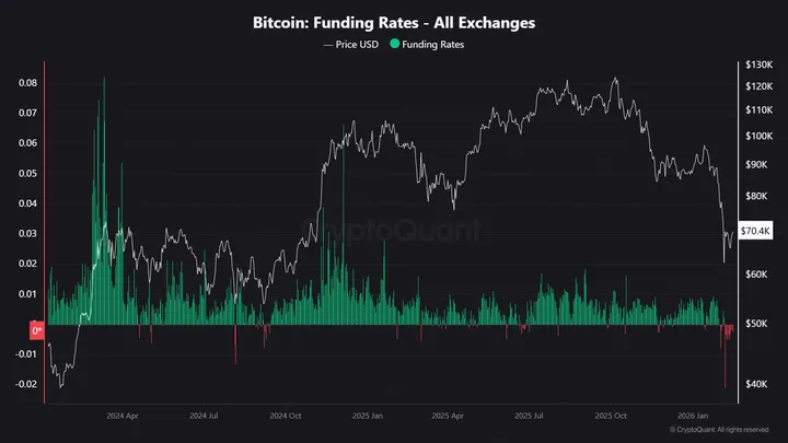 Funding rates op exchanges (zoals Binance, via CryptoQuant) spiegelen de hefboom-balans. Tijdens de 2025-rally naar $100k+ schoten ze omhoog naar 0,05%-0,08%: euforie en long-dominantie. Daarna daalden ze, consolidatie en minder speculatie.