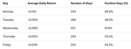 de aandelenmarkt. Daarin zien we dat maandag gemiddeld sterker is dan dinsdag,
