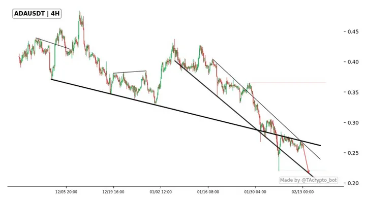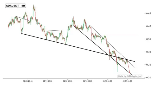 ADA) houdt de gemoederen bezig. Op de 4-uursgrafiek blijft de token stevig onder druk en schommelt binnen een dalend kanaal, na die harde afwijzing rond $0,38–$0,40.