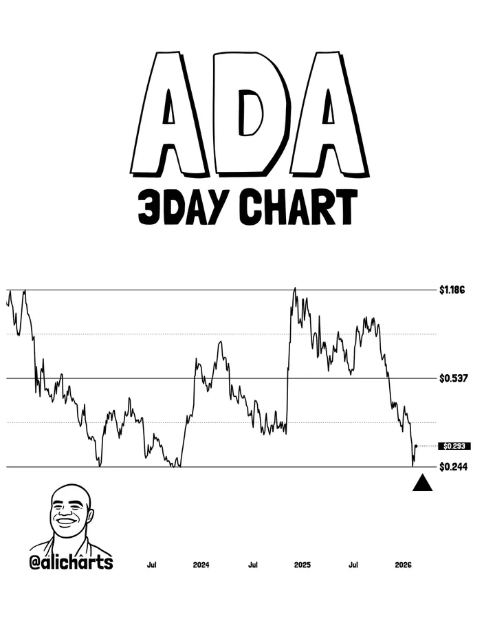 Populaire analist Ali Charts wijst op $0,244 als dé heilige graal-steun. Zolang ADA daarboven blijft, houdt de bullish structuur stand en groeit de kans op hogere levels. Een break daaronder zou het plaatje bearish maken.