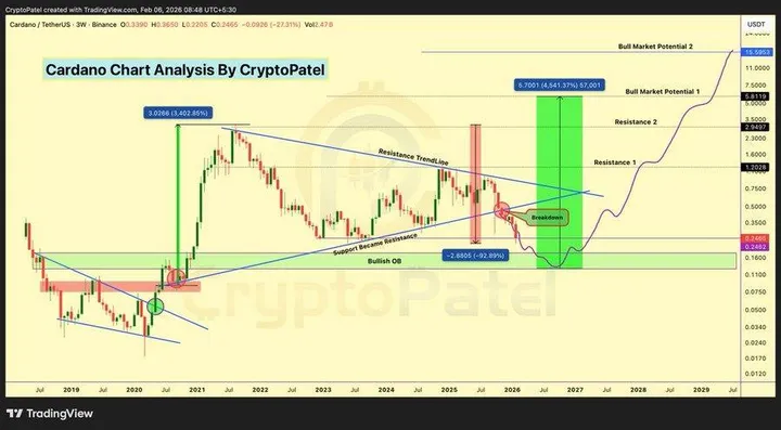 De lancering van CME Cardano-futures op 9 februari 2026 (zowel standaard als micro-contracts) zorgt voor extra buzz. Crypto Patel, een bekende stem in de space, voorspelt dat ADA meer dan 4500% kan stijgen als de belangrijke steun standhoudt.