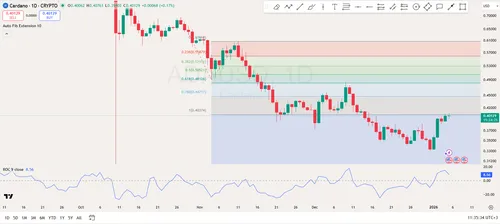 duidelijk te zien dat ADA een belangrijke Fibonacci-retracementzone heeft doorbroken. De Fib-niveaus zijn getrokken van een recent hoogtepunt rond $0,6067 naar een dieptepunt op $0,2783.