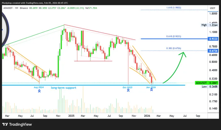 ADA) test een cruciale langetermijnsteunzone rond de $0,27, en de manier waarop de munt daarop reageert wekt voorzichtig optimisme bij technische analisten.