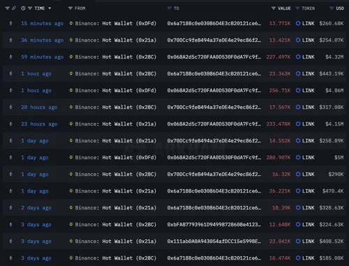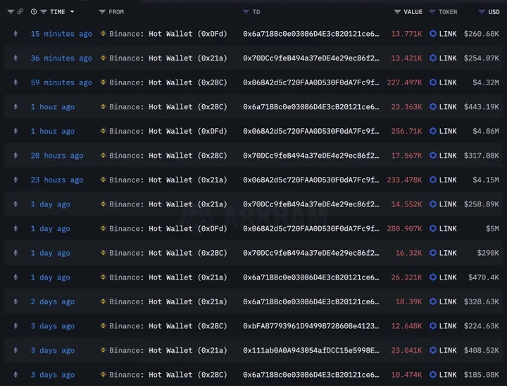schetst een duidelijk beeld: sinds de crash hebben 39 nieuwe wallets samen 9,94 miljoen LINK – goed voor zo'n 188 miljoen dollar – van Binance gehaald.