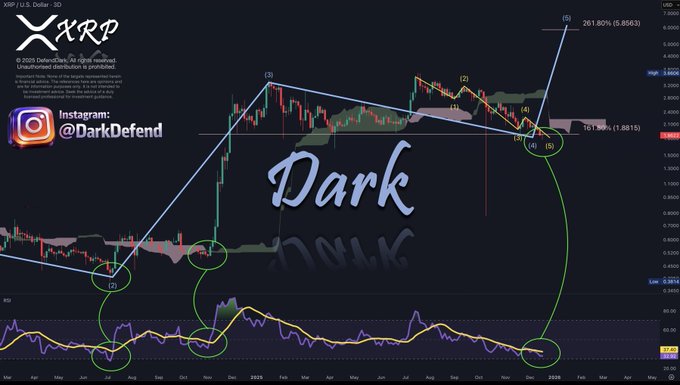 Dark Defender gebruikt ook Elliott Wave-tellingen: golven 1-5 van de correctie lijken voltooid. XRP staat nu aan het begin van een grotere golf 5 omhoog – potentieel het startschot voor een echte bullrun.