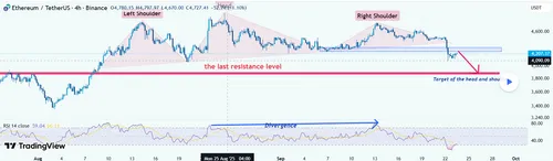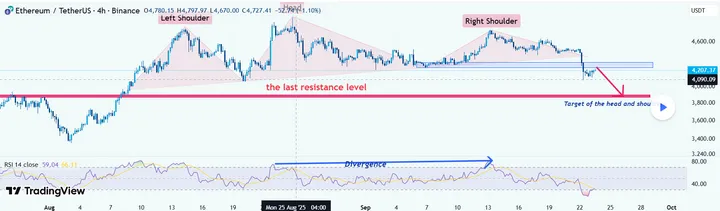 gooide recent een grafiek online via TradingView die het allemaal blootlegt: een hoofd-en-schouderformatie op de 4-uurschart van Ethereum.