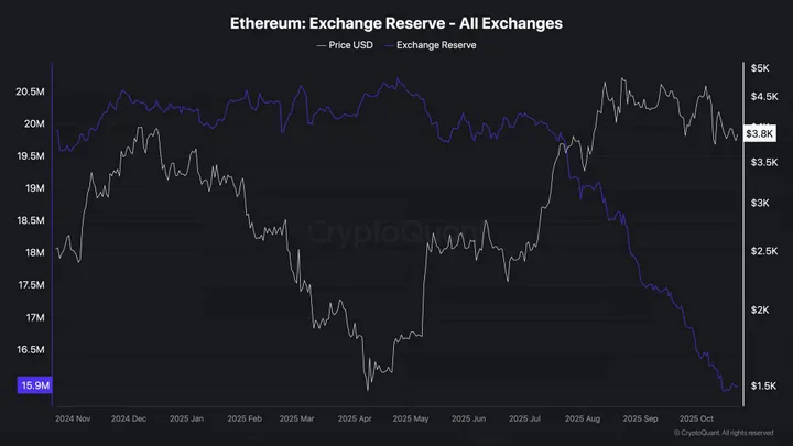 Volgens data van CryptoQuant zijn de ETH-reserves op gecentraliseerde beurzen gedaald naar 15,9 miljoen, een flinke afname ten opzichte van de 20 miljoen eind 2024.