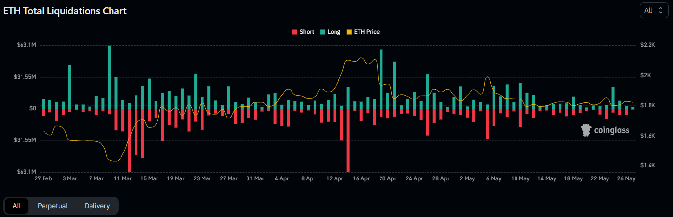 Ethereum koers heeft een tumultueuze tijd doorgemaakt, waarbij er een recordhoogte aan liquidaties, van meer dan $58 miljoen, plaatsvond in mei. Het digitale activum, momenteel bearish in de prijsklasse van $1.820, is gedurende een aanzienlijke periode gevangen binnen de prijsrange van ~$1.800. Ondanks een kleine stijging, blijft het groeipotentieel echter nog steeds overschaduwd door de liquidaties.