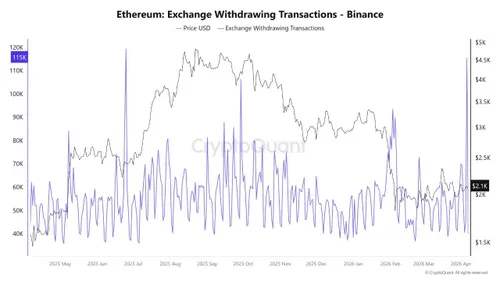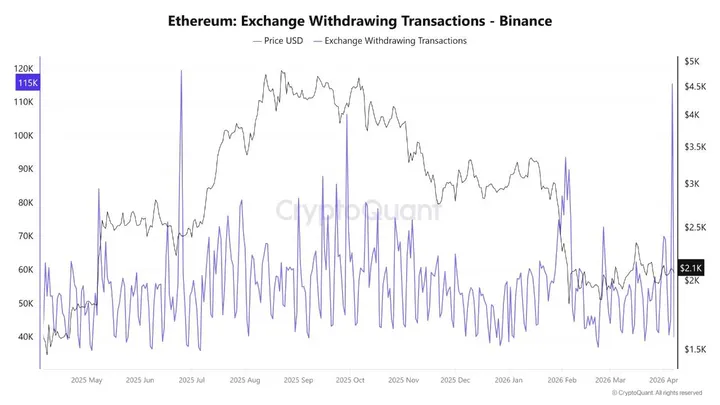 Daar komt een tweede datapunt bovenop. In een andere CryptoQuant-update liep het aantal ETH-withdrawaltransacties op Binance op naar ongeveer 115.685, het hoogste niveau sinds 2025. Tegelijk werd volgens dezelfde analyse in totaal ongeveer 352.000 ETH van het platform gehaald. Dat is relevant, omdat het erop wijst dat ETH niet alleen wordt gekocht, maar ook steeds vaker uit de directe handelsomgeving verdwijnt.