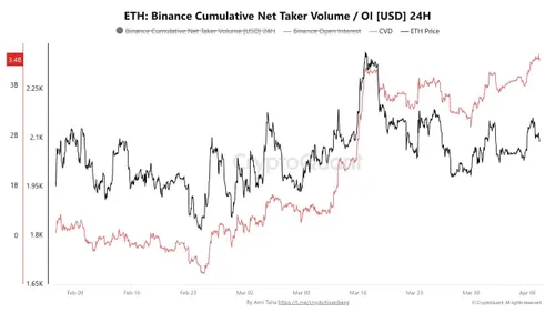CryptoQuant meldde dat de cumulative net taker volume voor ETH op Binance is opgelopen naar ongeveer $3,4 miljard. In gewone taal: agressieve kopers blijven toeslaan, terwijl de koers nog altijd onder de top van midden maart hangt. CryptoQuant zegt er zelf meteen bij dat de prijs die vraag nog niet overtuigend heeft bevestigd.
