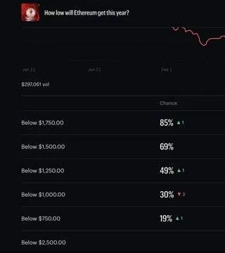 Voorspellingsmarkten zoals Kalshi weerspiegelen groeiende angst: traders prijzen ~49-50% kans op ETH onder $1.250 in 2026, met ~30% odds zelfs onder $1.000. Dat is geen lichte vrees – het wordt gefinancierd door positionering, gedreven door ETF-uitstroom, institutionele verkoopdruk en twijfel over value capture in Layer 2's.