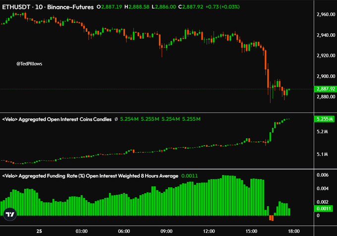 merkt op dat ETH stabiel rond $2.900 handelt na een sterke uitverkoop. Open interest klimt naar 5,255 miljoen – meer posities worden geopend ondanks de zijwaartse prijs. Financiering blijft licht positief (0,0011%), maar daalt, wat wijst op minder bullish enthousiasme: