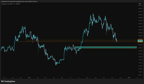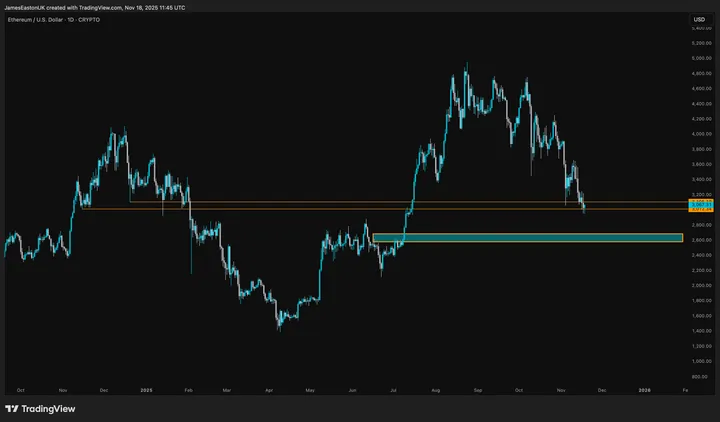 Breder gezien hangt ETH nu boven een vraaggebied tussen $2.600 en $2.800, wat analisten zien als een mogelijke middellange-termijnvloer.