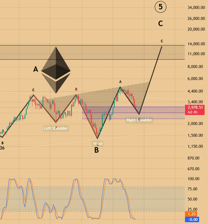 Linkerschouder, diepere kop en rechterschouder – het klassieke bullish-reversal-teken op de dagelijkse candles. De neklijn ligt net boven $3.000, precies waar ETH al meerdere keren steun vond.