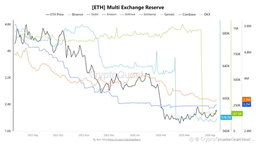 Volgens nieuwe data van CryptoQuant zijn de ETH-reserves op zowel Coinbase als Binance de afgelopen maanden fors teruggelopen. Op Coinbase daalde de voorraad van ongeveer 5,6 miljoen ETH begin augustus 2025 naar 3,2 miljoen ETH op 9 april 2026.