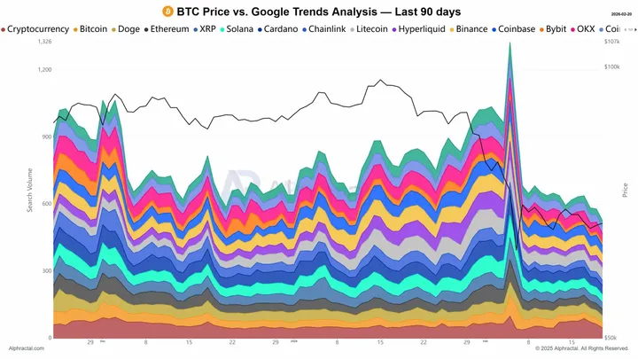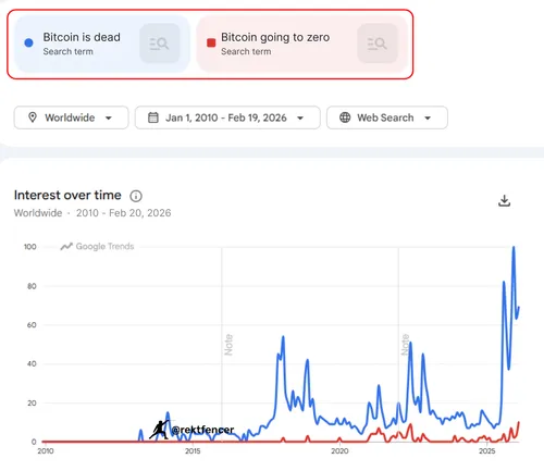 Ironisch genoeg explodeert de zoekopdracht "Bitcoin is dead" of "Bitcoin going to zero" juist nu naar recordniveaus. Volgens Google Trends piekte "Bitcoin going to zero" op 100 in februari 2026 – het hoogste sinds 2022, hoger dan na de FTX-crash.