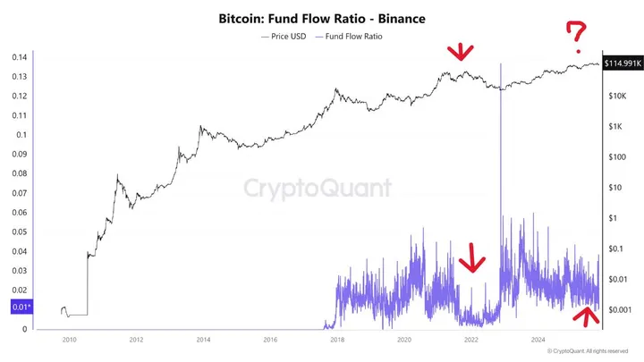 Bitcoin staat op $114.198. De uitbraak boven $115.000 voelt voor TedPillows als een “liquiditeitsgreep” zonder institutionele steun, nieuw kapitaal of retail-FOMO.