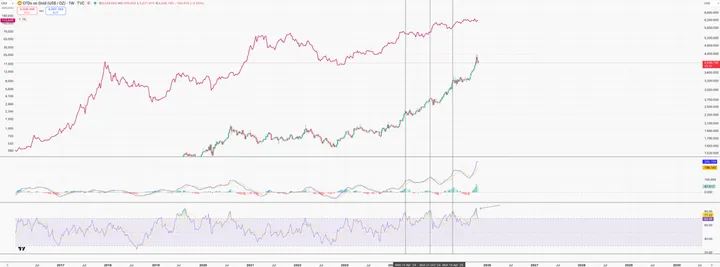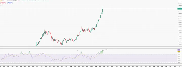 RSI op de weekly chart van goud geeft nu signalen van uitputting. De lijnen