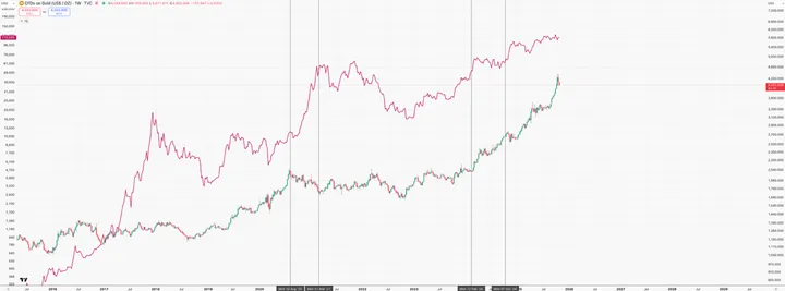 goud stijgt, presteert Bitcoin doorgaans zwakker, en zodra goud afkoelt, zien