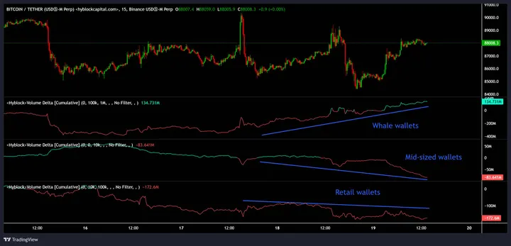 Hyblock-data bevestigen: cumulatieve volume delta (CVD) toont dat mega-wallets ($100k-$10M) deze week +$135 miljoen scoorden, terwijl retail ($0-$10k) en mid-size ($10k-$100k) respectievelijk -$84 miljoen en -$172 miljoen lieten zien. Whales vangen de verkoop op, kleinere spelers de-escaleren.