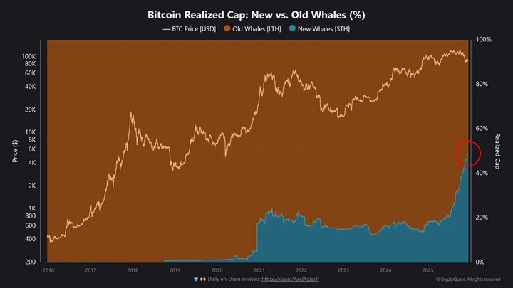 Volgens CryptoQuant vertegenwoordigen nieuwe whales nu bijna 50% van de gerealiseerde marktkapitalisatie van Bitcoin. Die metric meet de waarde van alle BTC tegen de prijs waarop ze laatst bewogen – een goede indicatie van de gemiddelde kostbasis.