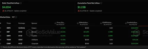 Volgens SoSoValue registreerden spot XRP-ETF's op 19 februari een netto instroom van $4,05 miljoen โ een sterke ommekeer van eerdere uitstroom ($2,21 miljoen midweek), een plus van 83%. Dat past in een patroon: inflows trotseren marktvolatiliteit, met cumulatief meer dan $1,2-1,3 miljard sinds lancering.