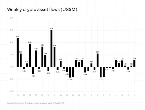 meldde het bedrijf op 13 april een wekelijkse instroom van $1,03 miljard in digitale-assetproducten, waarvan $790 miljoen naar bitcoin-producten ging. De year-to-date instroom stond daarbij op $1,88 miljard. Dat zijn geen cijfers die passen bij een markt die nog steeds aan de zijlijn staat.