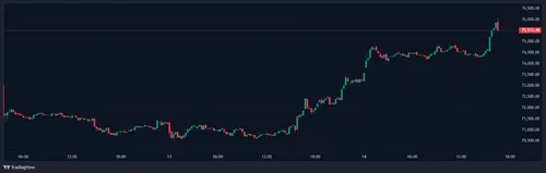 BTC rond $75.957, na een intraday beweging tussen $71.696 en $75.957. Daarmee heeft de markt de zwakke start van de week in één ruk van zich afgeschud.