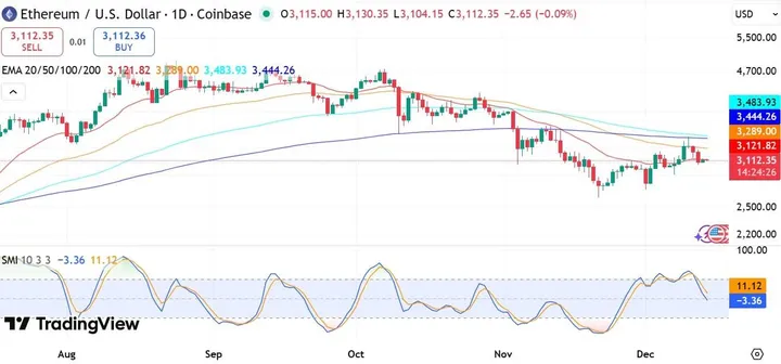 ETH) krijgt klappen: afgewezen op $3.400, dip naar $3.045, nu rond $3.118 (+0,03% dag, +2,5% week). Maar whales zien dit als koopkans! Een grote whale ruilde 1.969