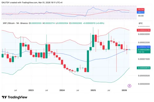 XRP/BTC-grafiek. Daar brak de koers door het middelste Bollinger Band-niveau – het 20-maands voortschrijdend gemiddelde – naar beneden.