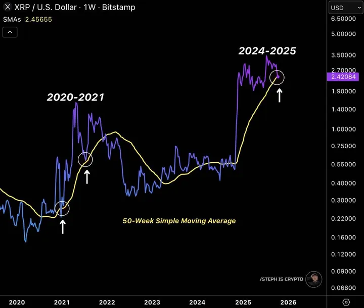 dropte een bom op X met een chart die de XRP-prijsbeweging van nu vergelijkt met de wilde rit uit 2020-2021. Die gele lijn – de 50-weeks simple moving average (SMA) – springt meteen in het oog, samen met die parallelle patronen die schreeuwen om een herhaling.