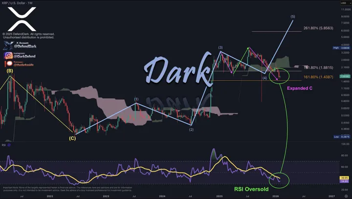 Volgens hem heeft XRP een complexe 'Expanded C'-golf afgerond – dat markeert vaak het einde van de correctie. Zodra steun en momentum bevestigd worden, kan de hogere-orde impuls hervatten. Dat geeft traders een heldere blauwdruk: de bodem lijkt in, de opwaartse druk bouwt op.