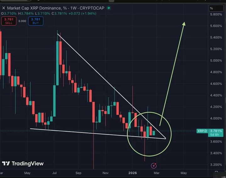 Bird merkt op dat XRP-dominantie nu bijna het eindpunt van de wig heeft bereikt. Historisch gezien leiden zulke patronen vaak tot krachtige uitbraken als ze bullish oplossen.