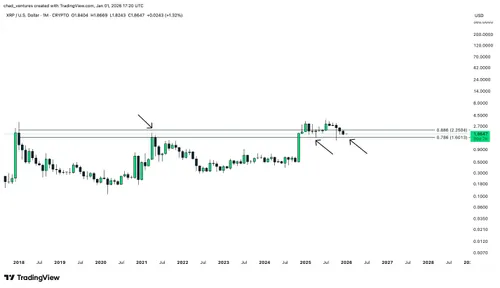 Alles bij elkaar lijkt XRP vooral in een consolidatiefase te zitten. De koers beweegt binnen het logaritmische Fib-bereik van 0,786 tot 0,886. De markt wacht op een duidelijke katalysator voor de volgende grote beweging.
