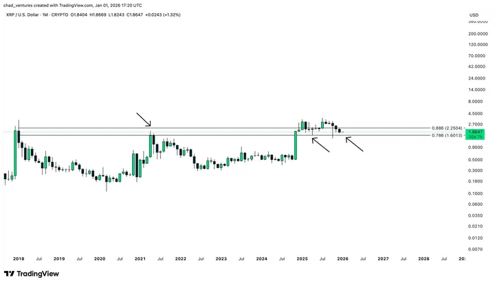Op de hogere timeframe is een dubbele top zichtbaar. Chad benadrukt echter dat die niet per se hoeft af te maken zolang XRP boven het logaritmische Fibonacci-niveau van 0,786 blijft.