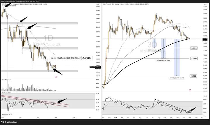 Bij versnellende verkoopdruk kan een daling dus sneller gaan dan verwacht. Umair Crypto wijst mogelijke neerwaartse niveaus aan rond 1,45, 1,10 en 0,69 dollar bij een bevestigde breuk.