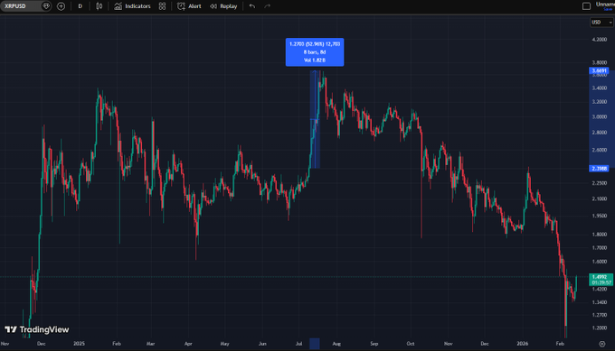 Op de USD-grafiek oogt XRP nog correctief met lagere highs/lows na de piek van juli 2025 op $3,65. Na de dip onder $1,15 begin februari herstelde het naar circa $1,46-$1,48 (rond 16 februari 2026).